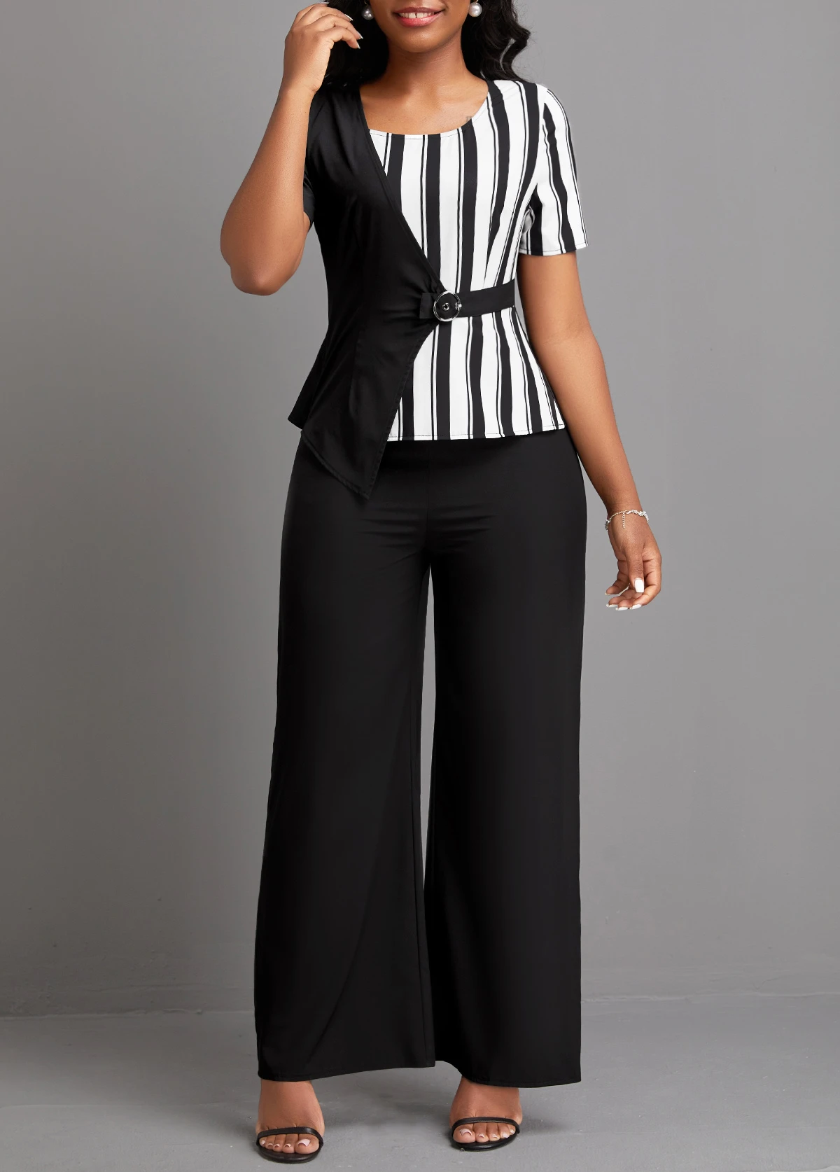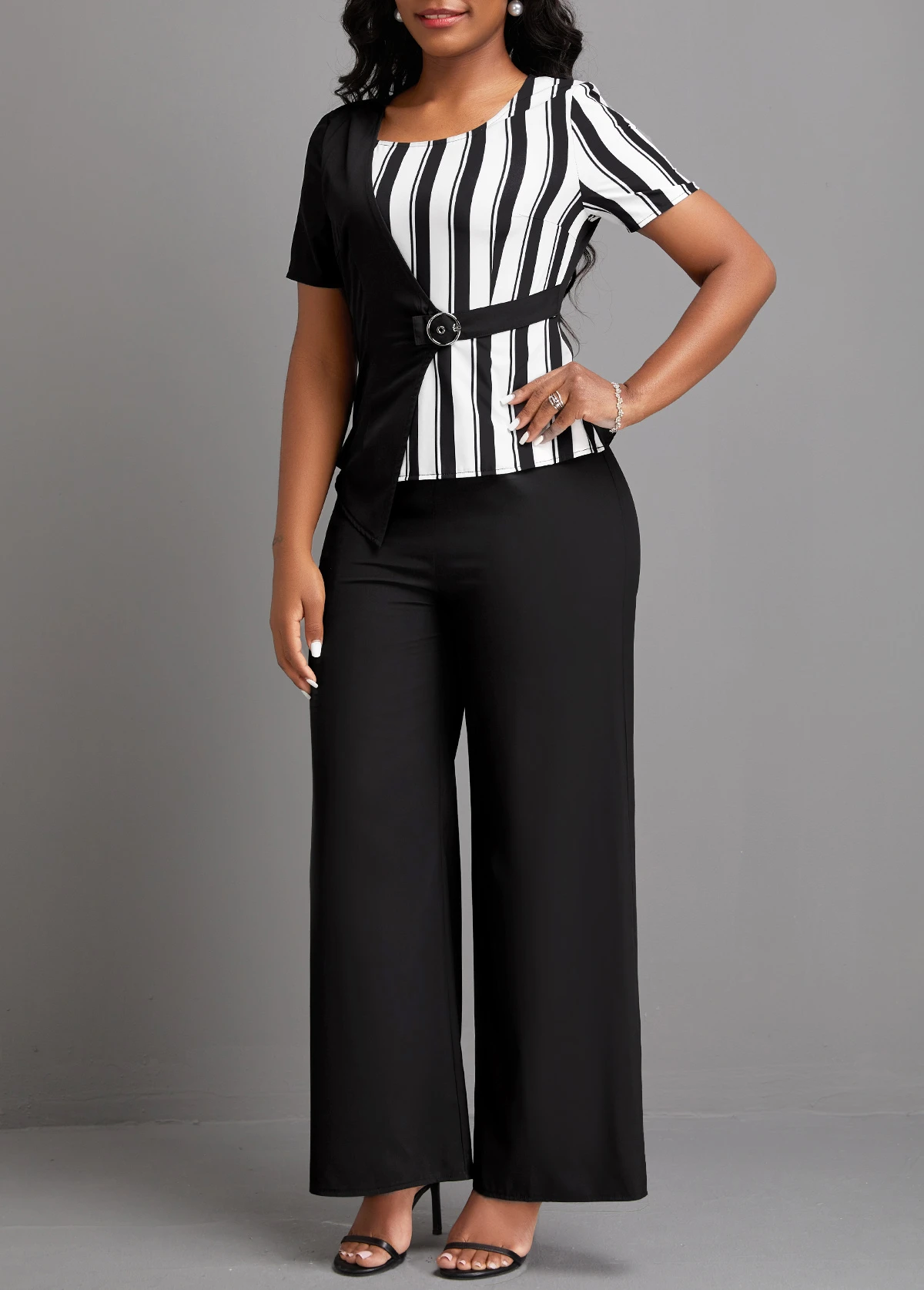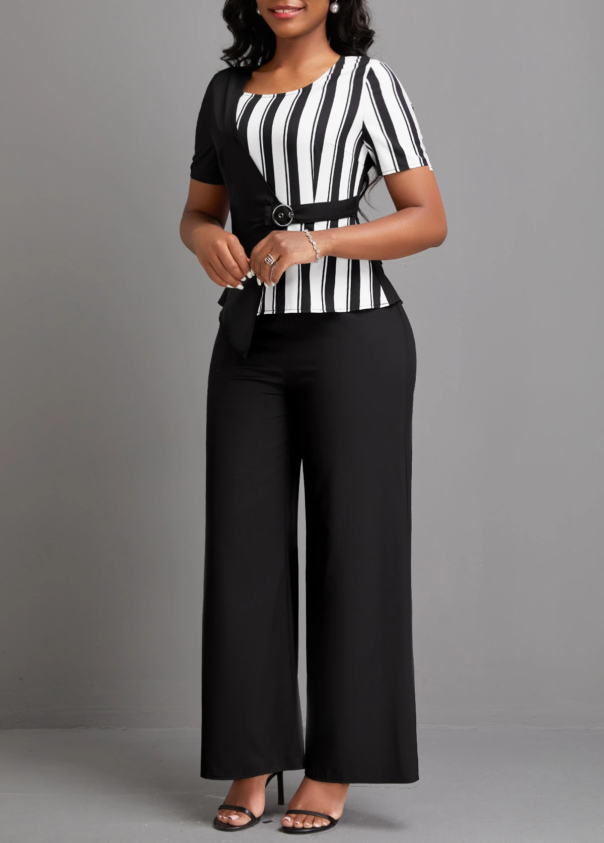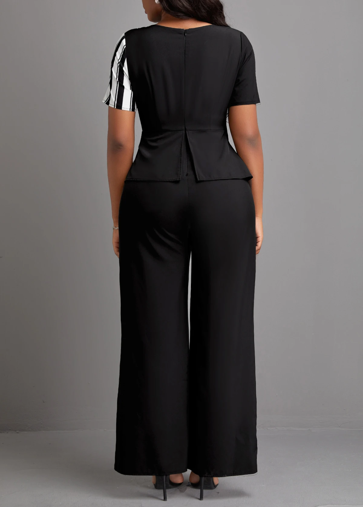 Black Patchwork Striped Ankle Length Short Sleeve Jumpsuit