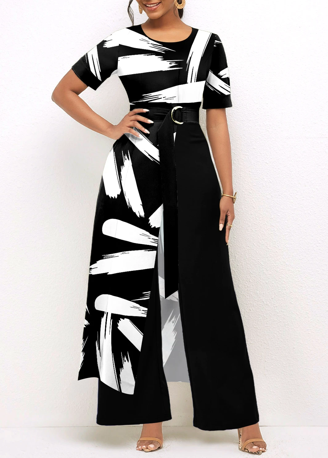 Brush Stroke Print Belted Black Pocket Jumpsuit