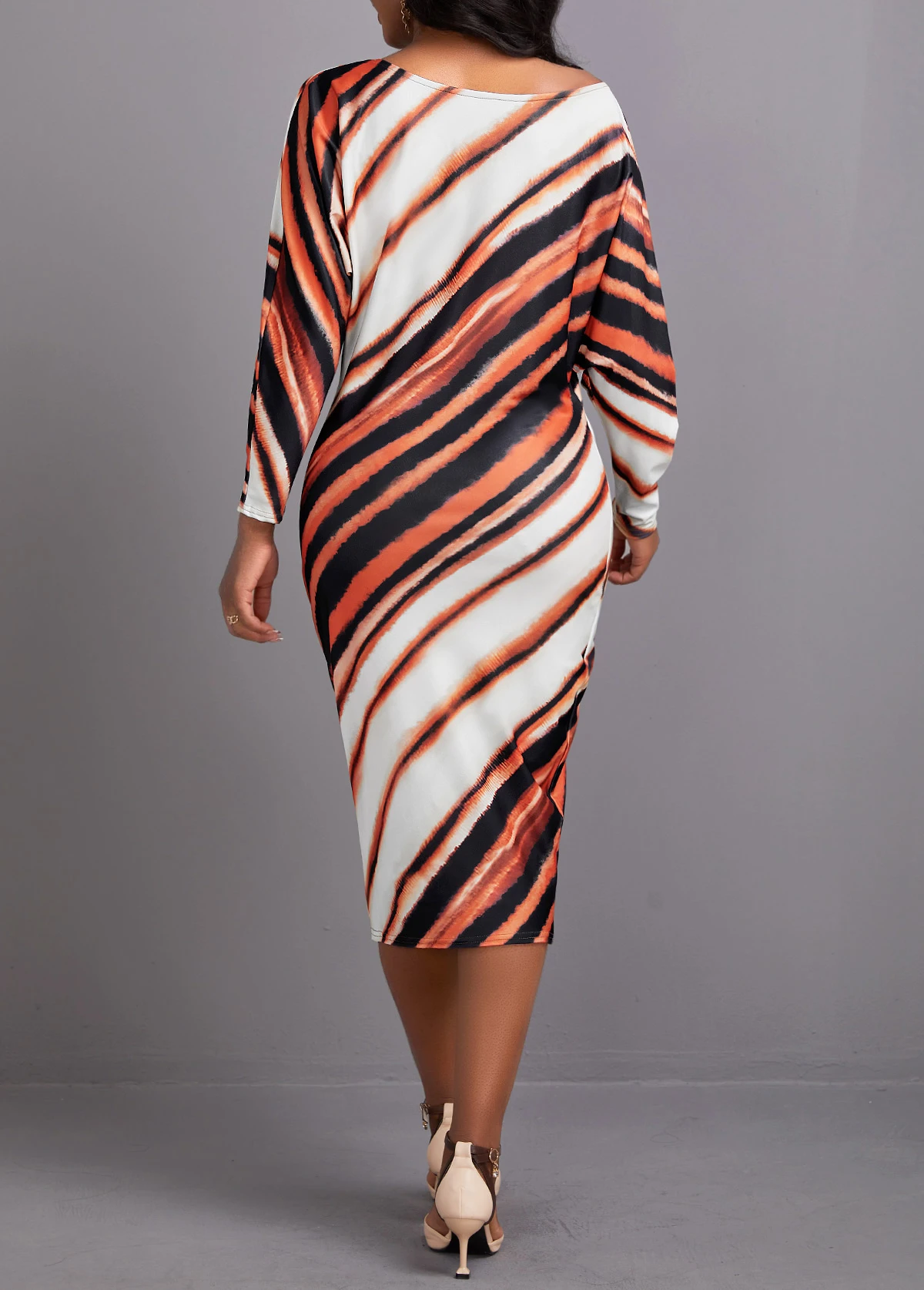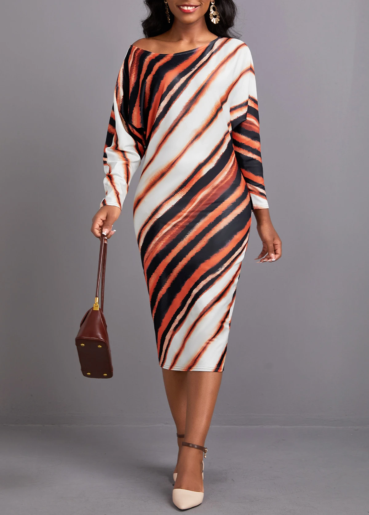 Dark Coffee Asymmetry Striped Long Sleeve Bodycon Dress