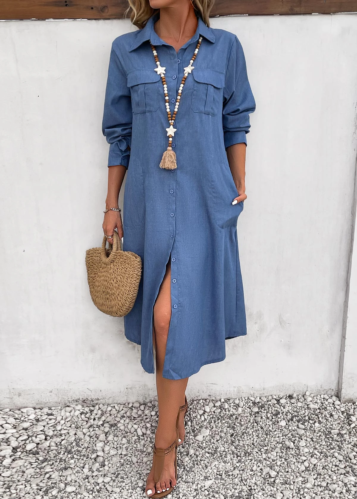 Dusty Blue Pocket Long Sleeve Shift Dress