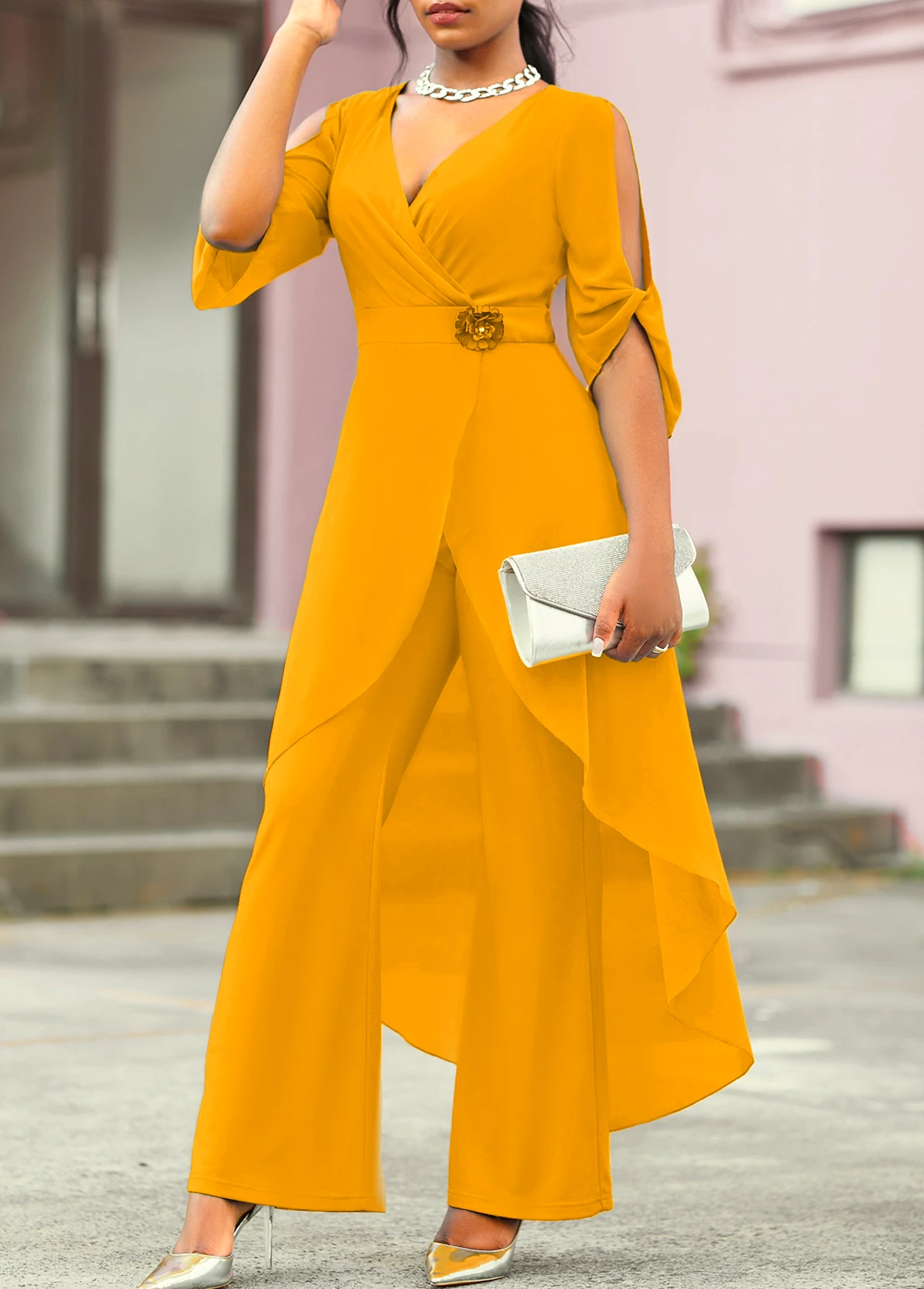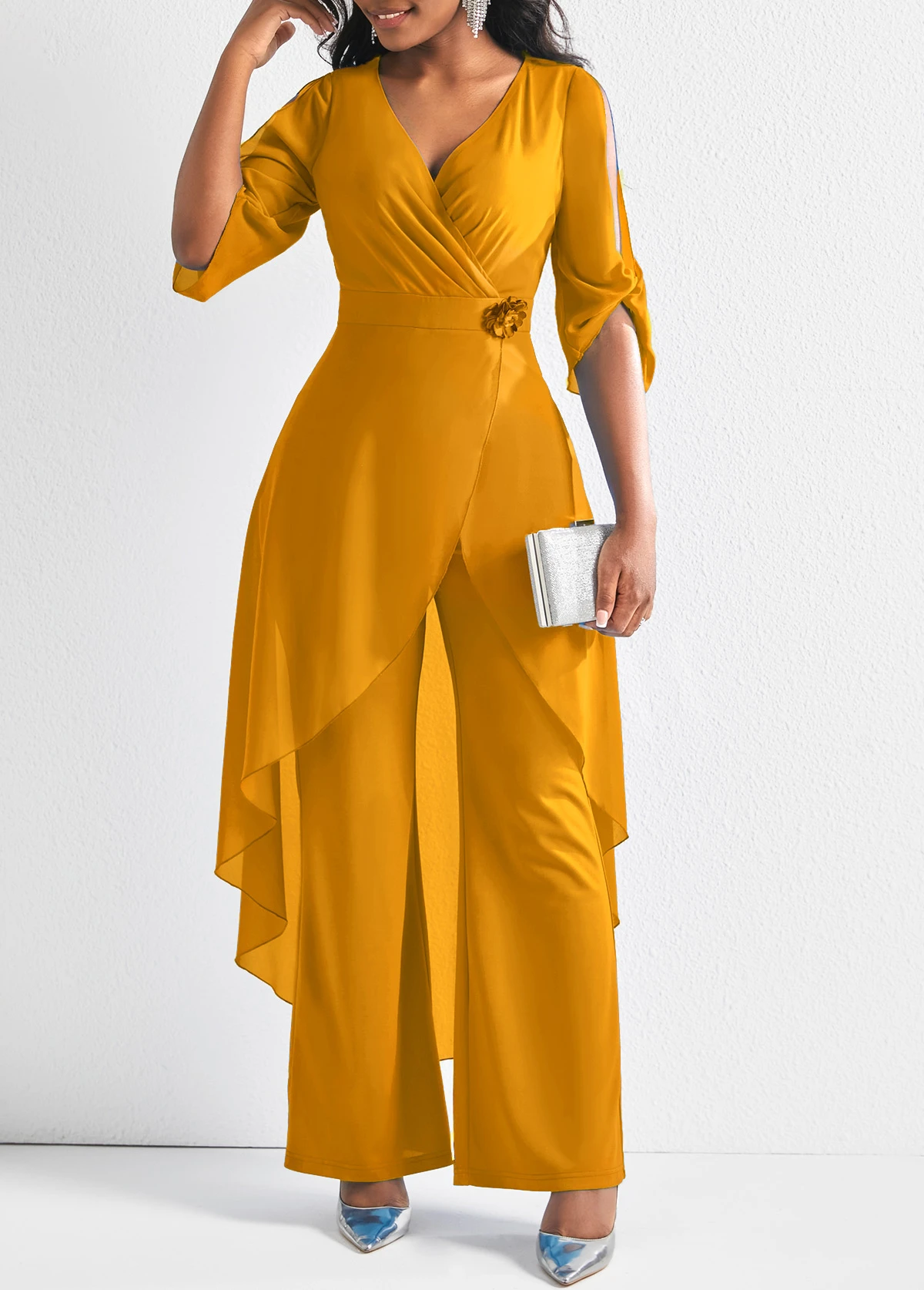 Flower Decoration Chiffon Ginger 3/4 Sleeve Jumpsuit