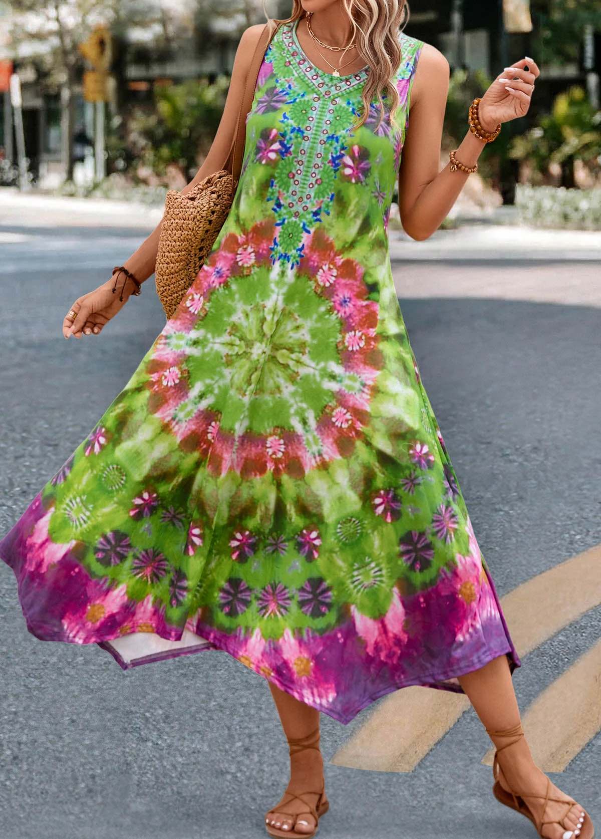 Green Handkerchief Hem Tie Dye Print Dress
