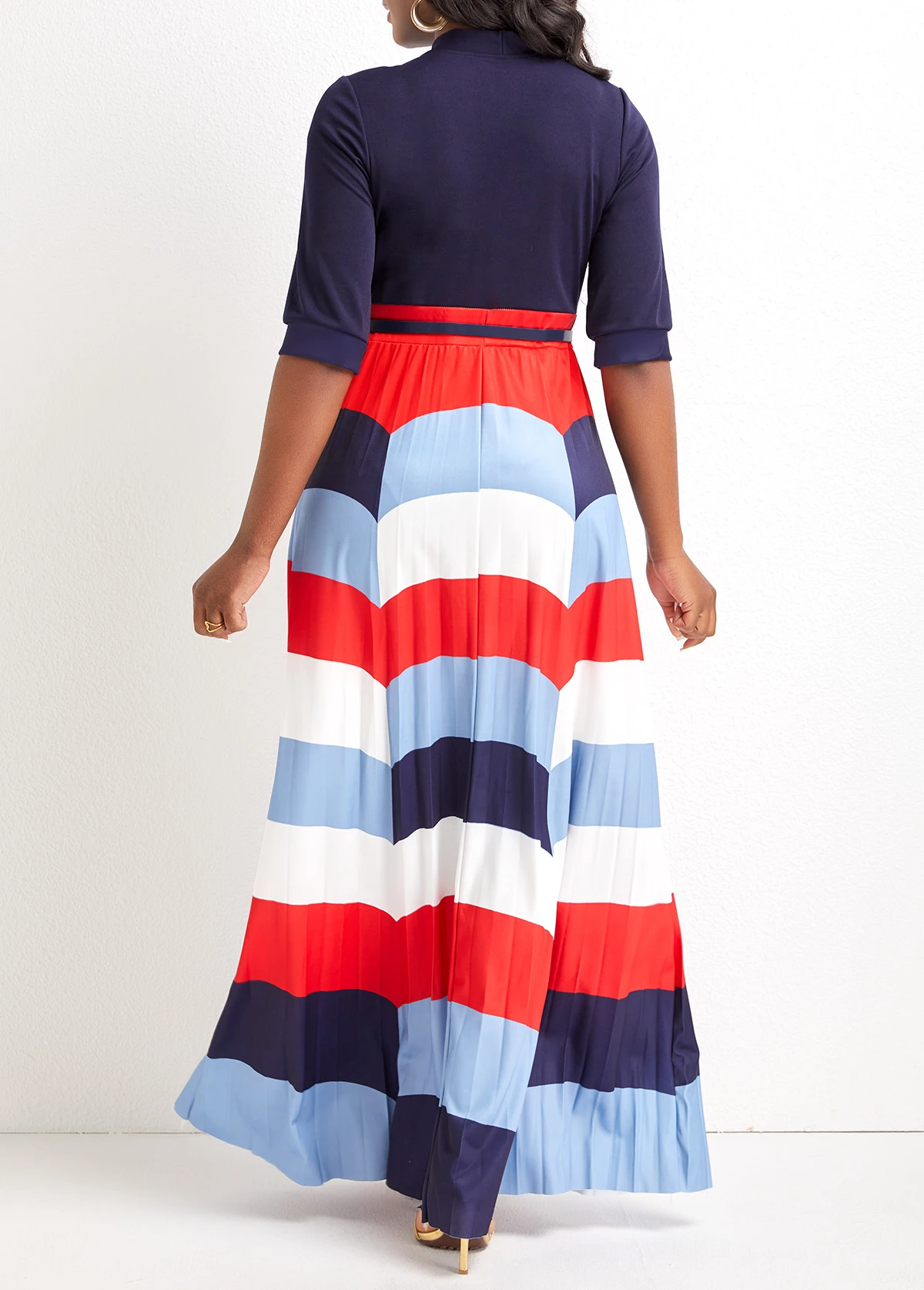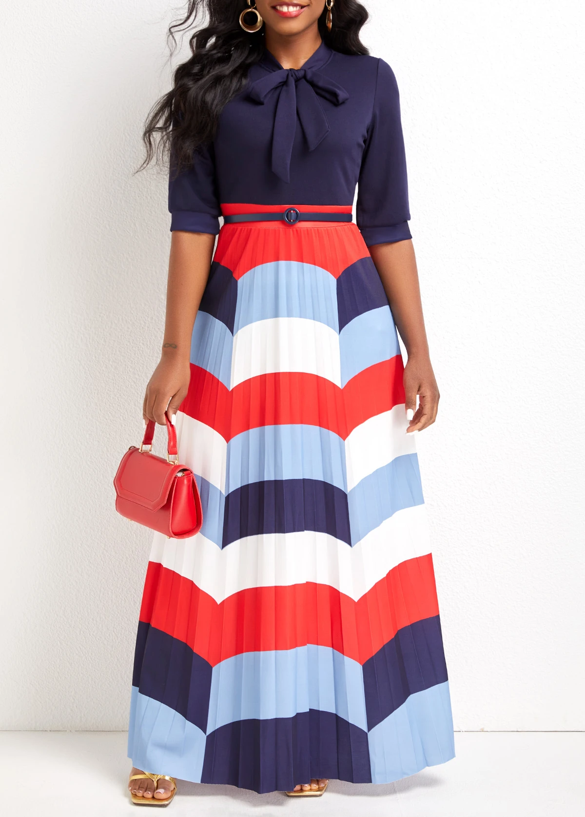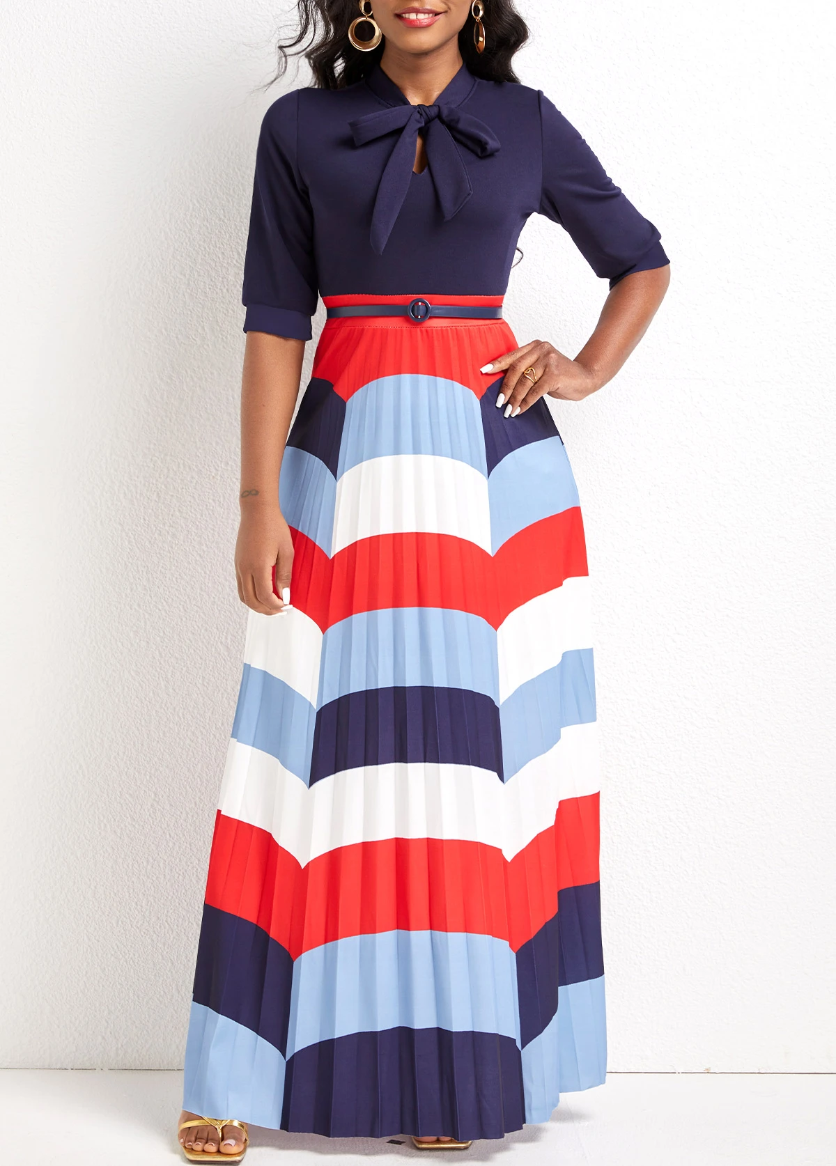 Navy Bowknot Wave Pattern Print Maxi Dress