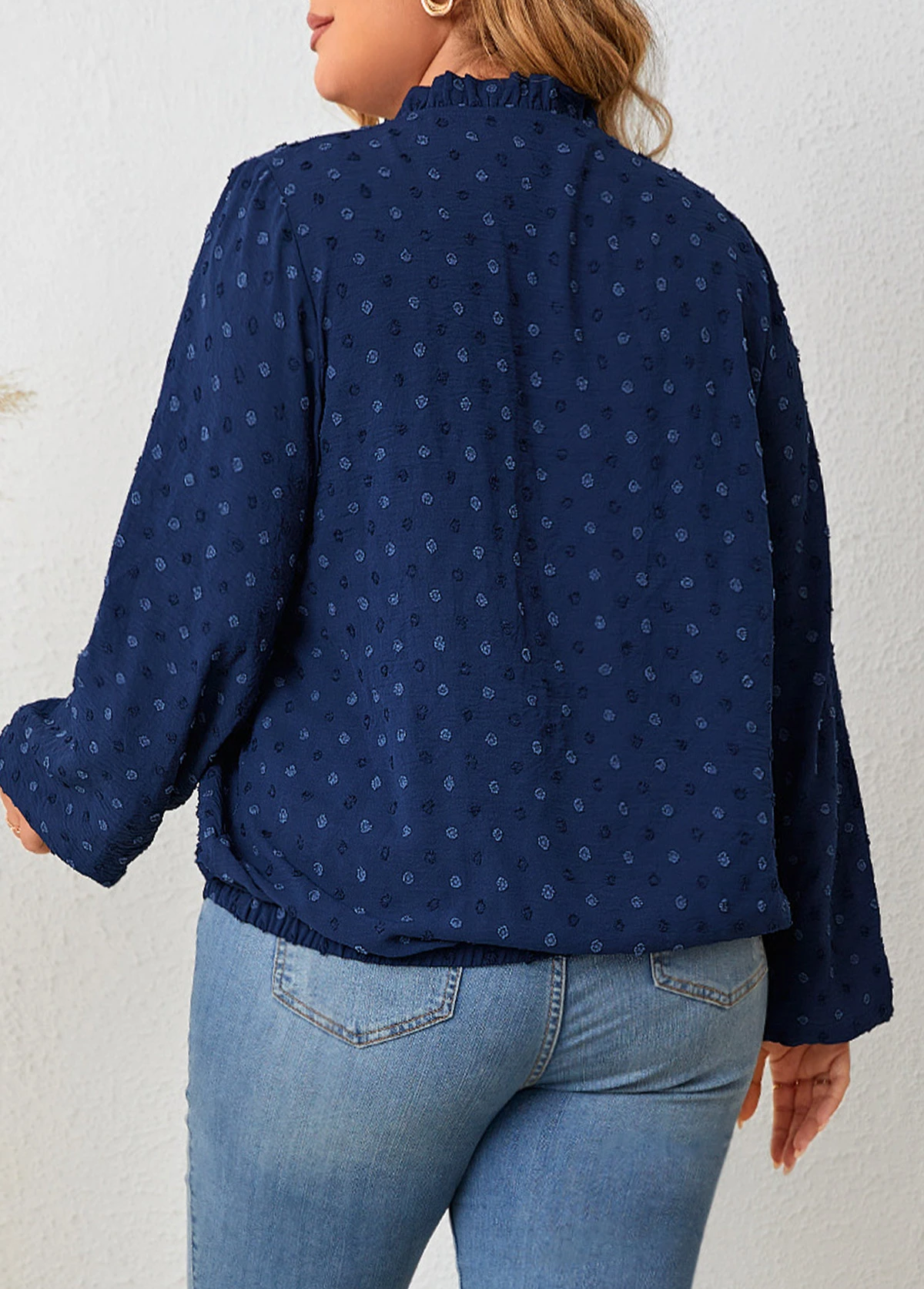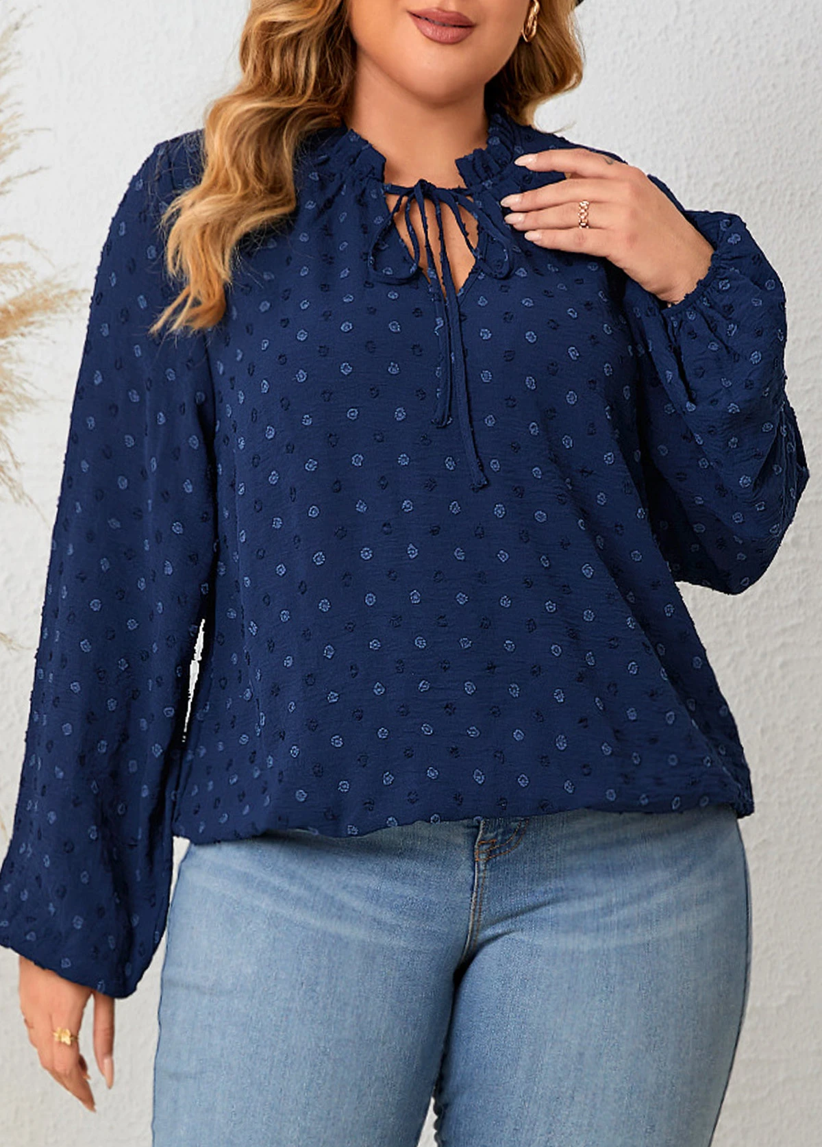 Navy Lace Up Plus Size Long Sleeve Blouse