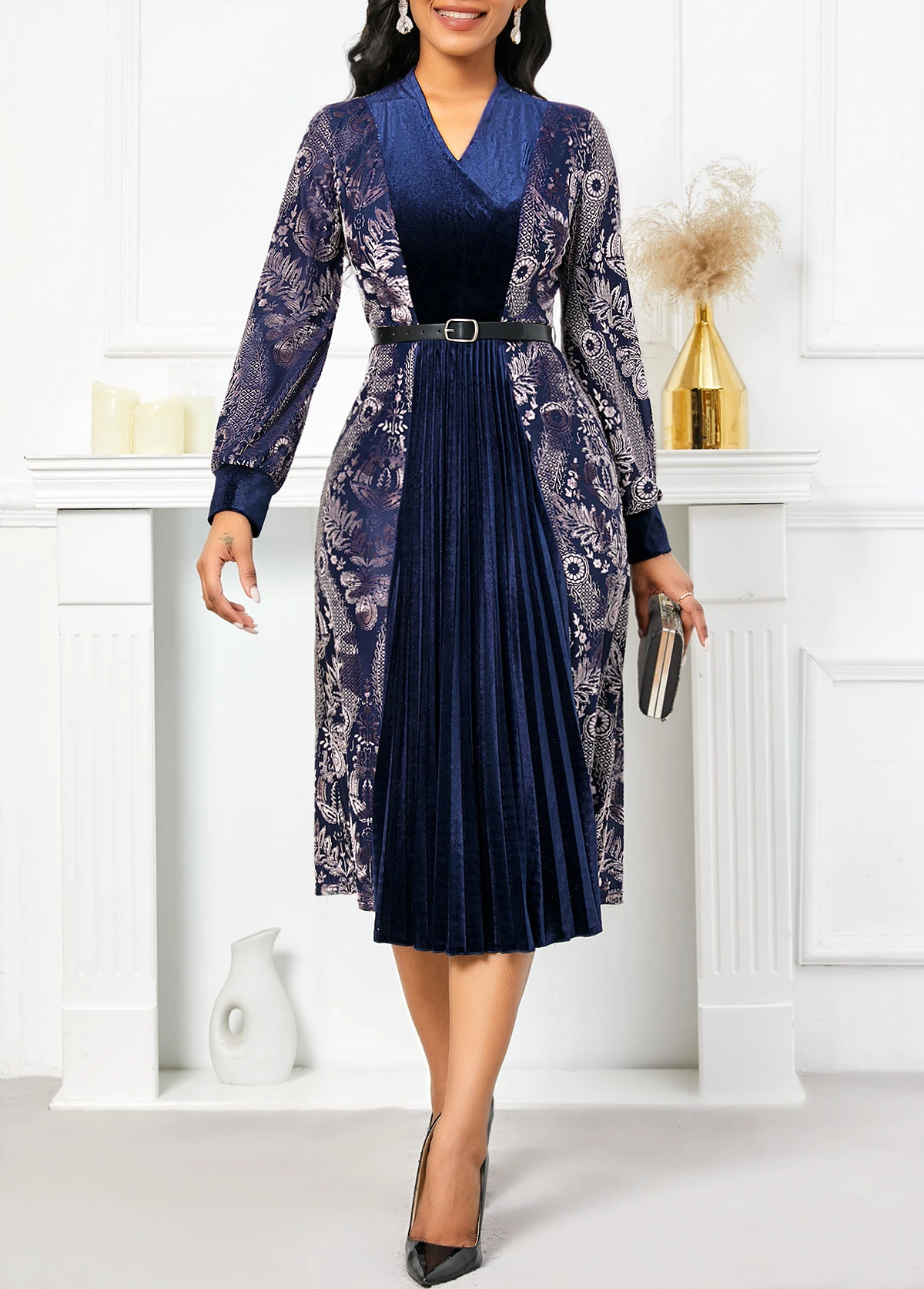 Navy Velvet Tribal Print Belted Long Sleeve Dress