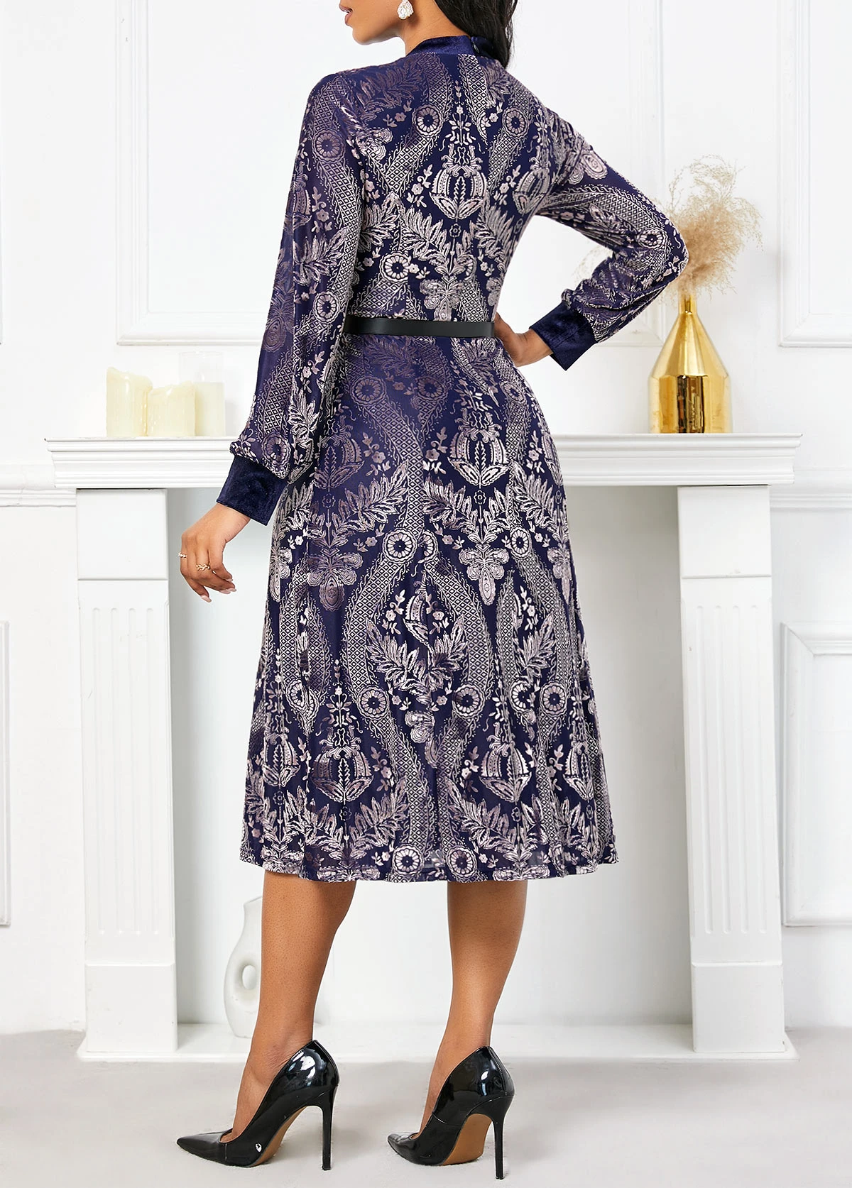 Be the first to review “Navy Velvet Tribal Print Belted Long Sleeve Dress” Cancel reply