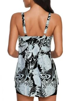 Patchwork Tropical Plants Print Blackish Green Swimdress Set