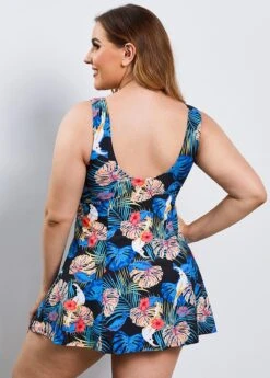 Tropical Print Bowknot Sash V Neck Swimdress And Shorts