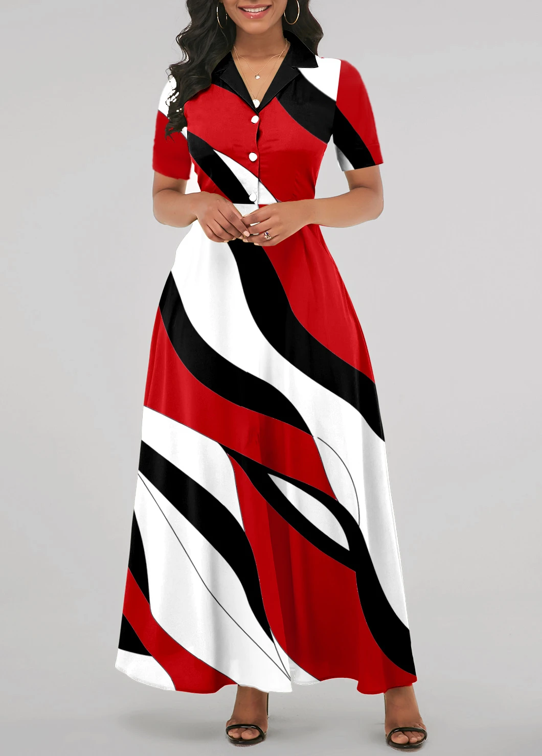 Red Pocket Geometric Print Short Sleeve Maxi Dress
