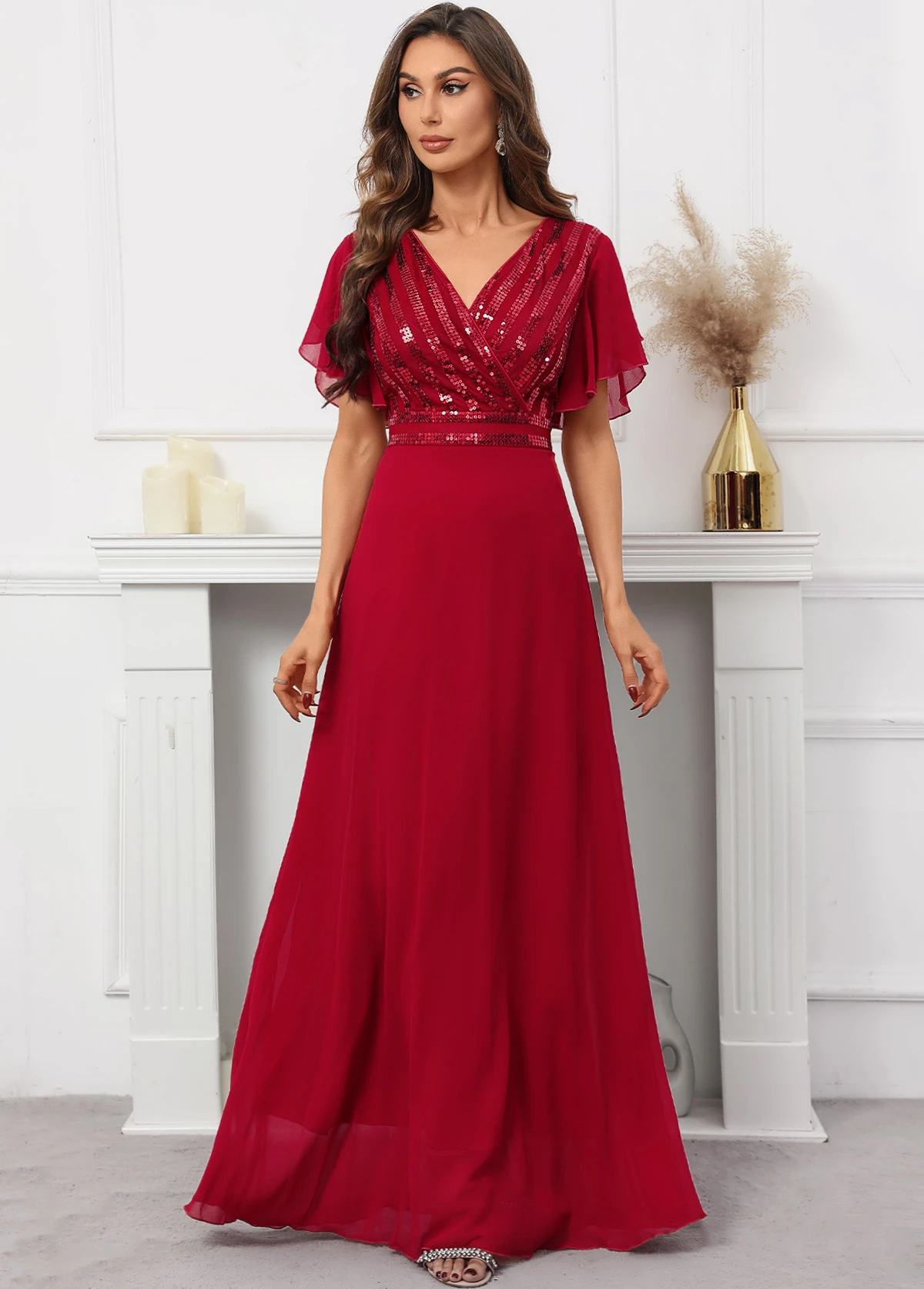 Red Sequin Short Sleeve V Neck Dress
