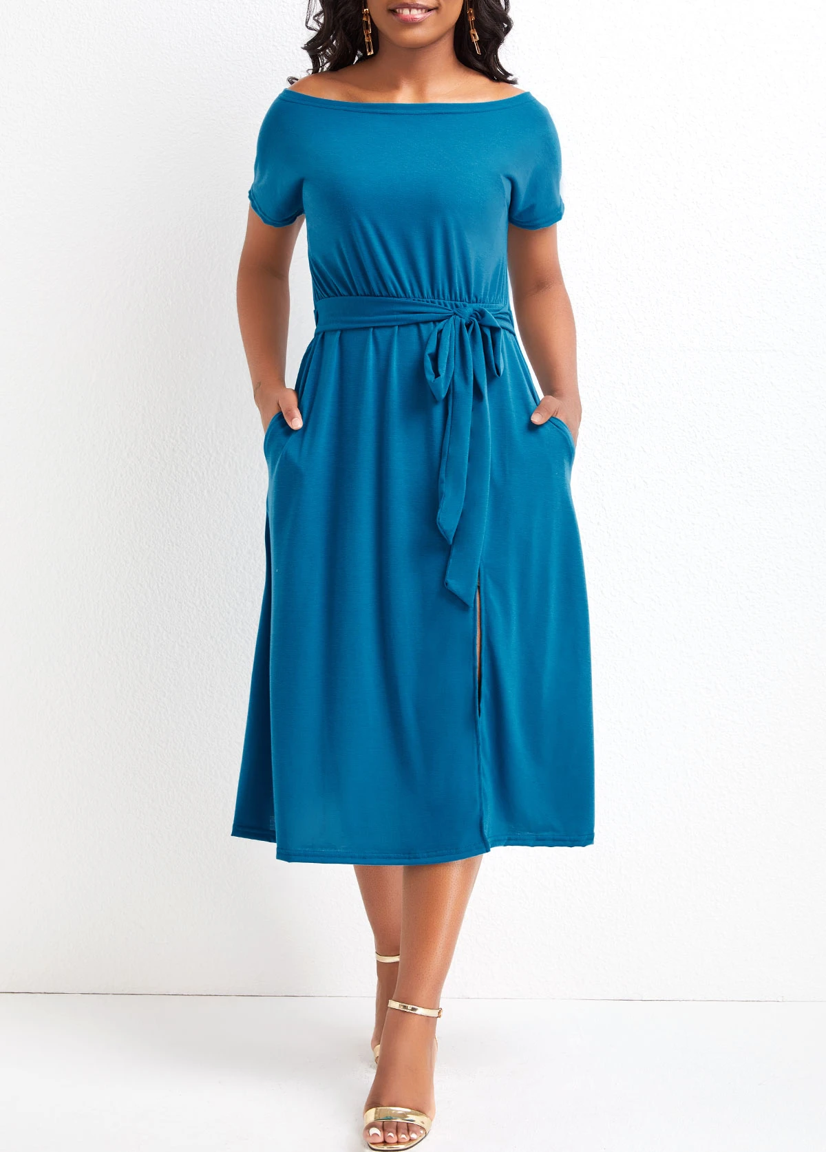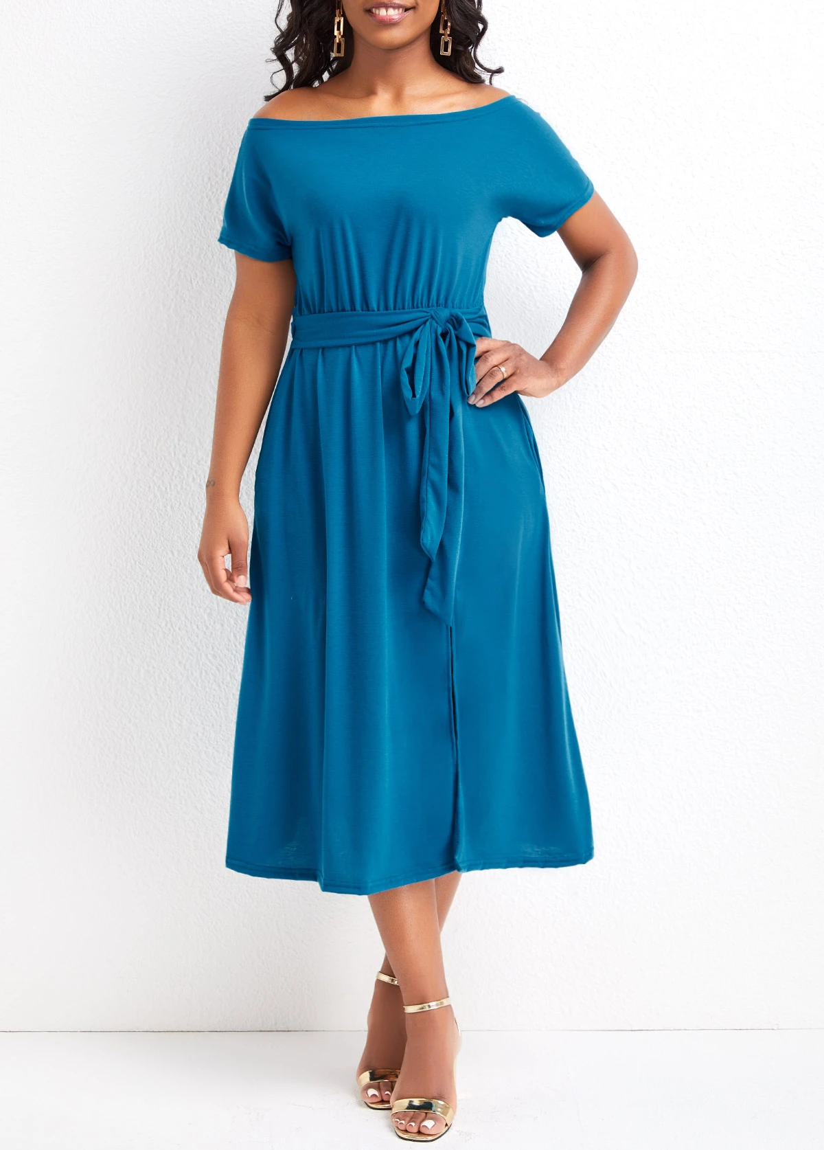 Be the first to review “Sky Blue Split Short Sleeve Off Shoulder Dress” Cancel reply