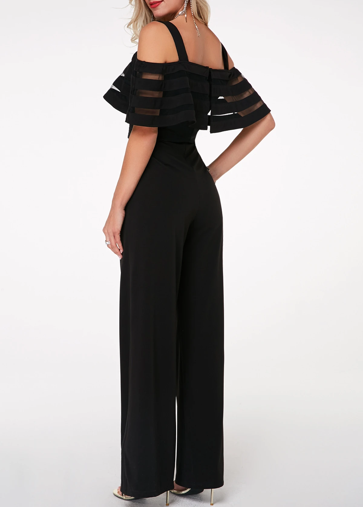 Strappy Cold Shoulder Ruffle Overlay Black Jumpsuit
