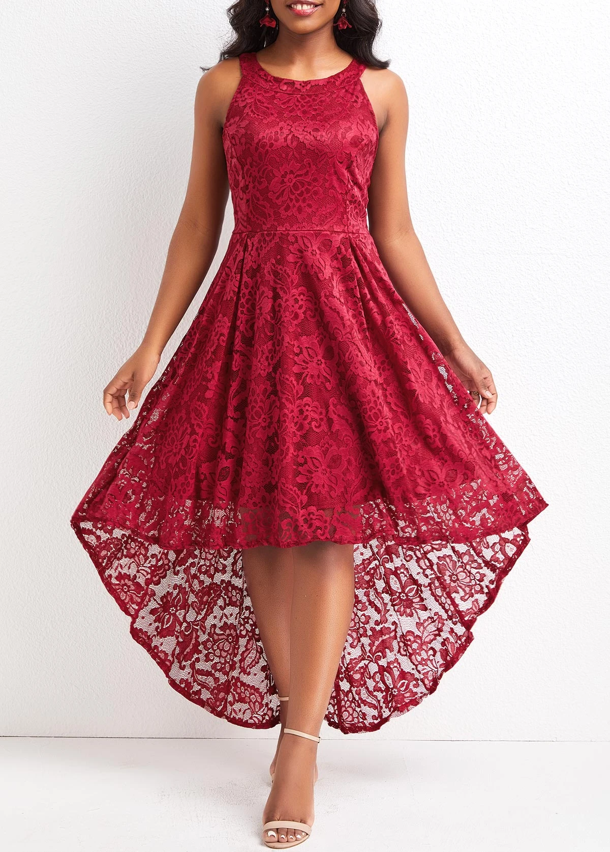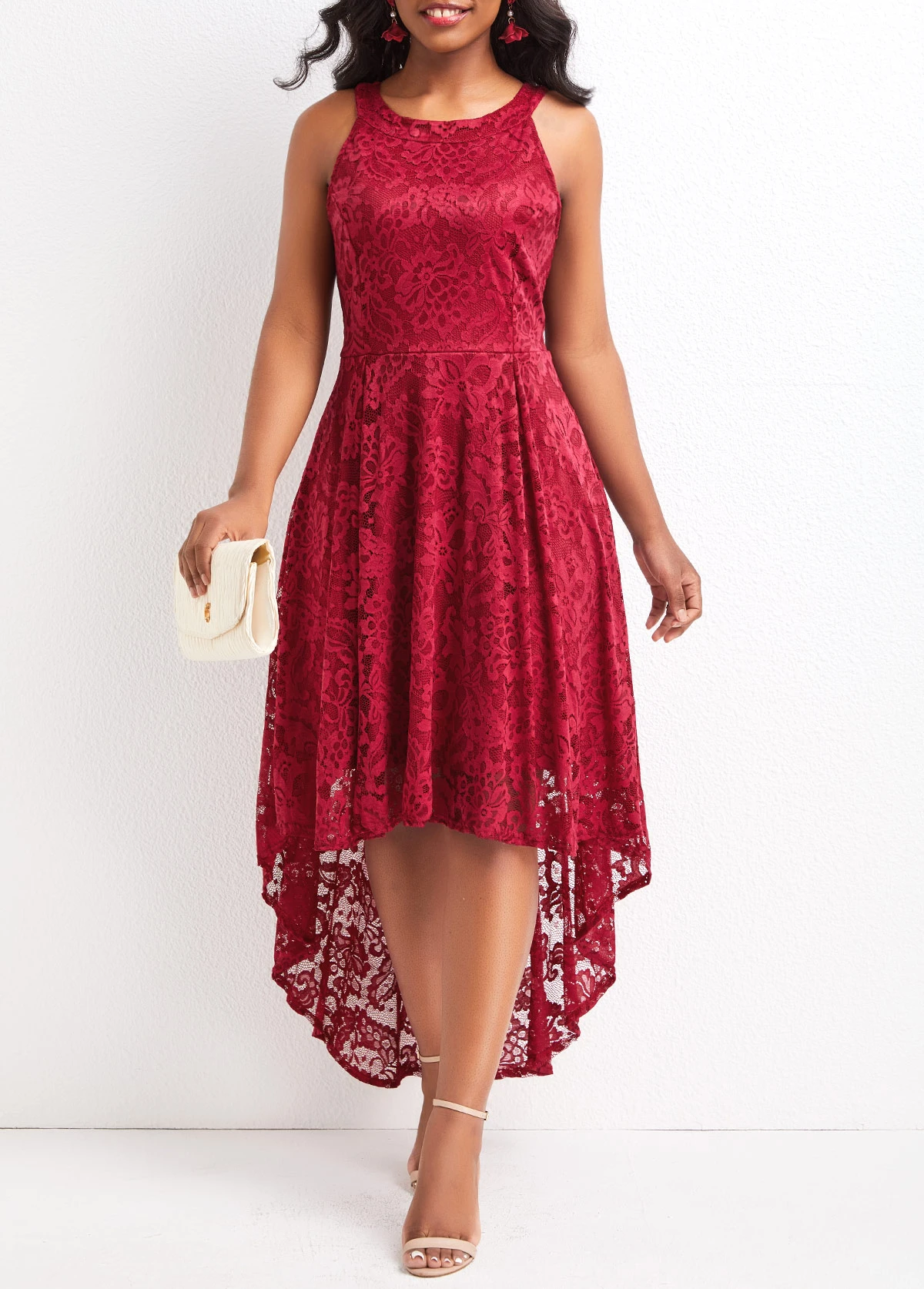 Be the first to review “Wine Red Lace High Low Sleeveless Dress” Cancel reply