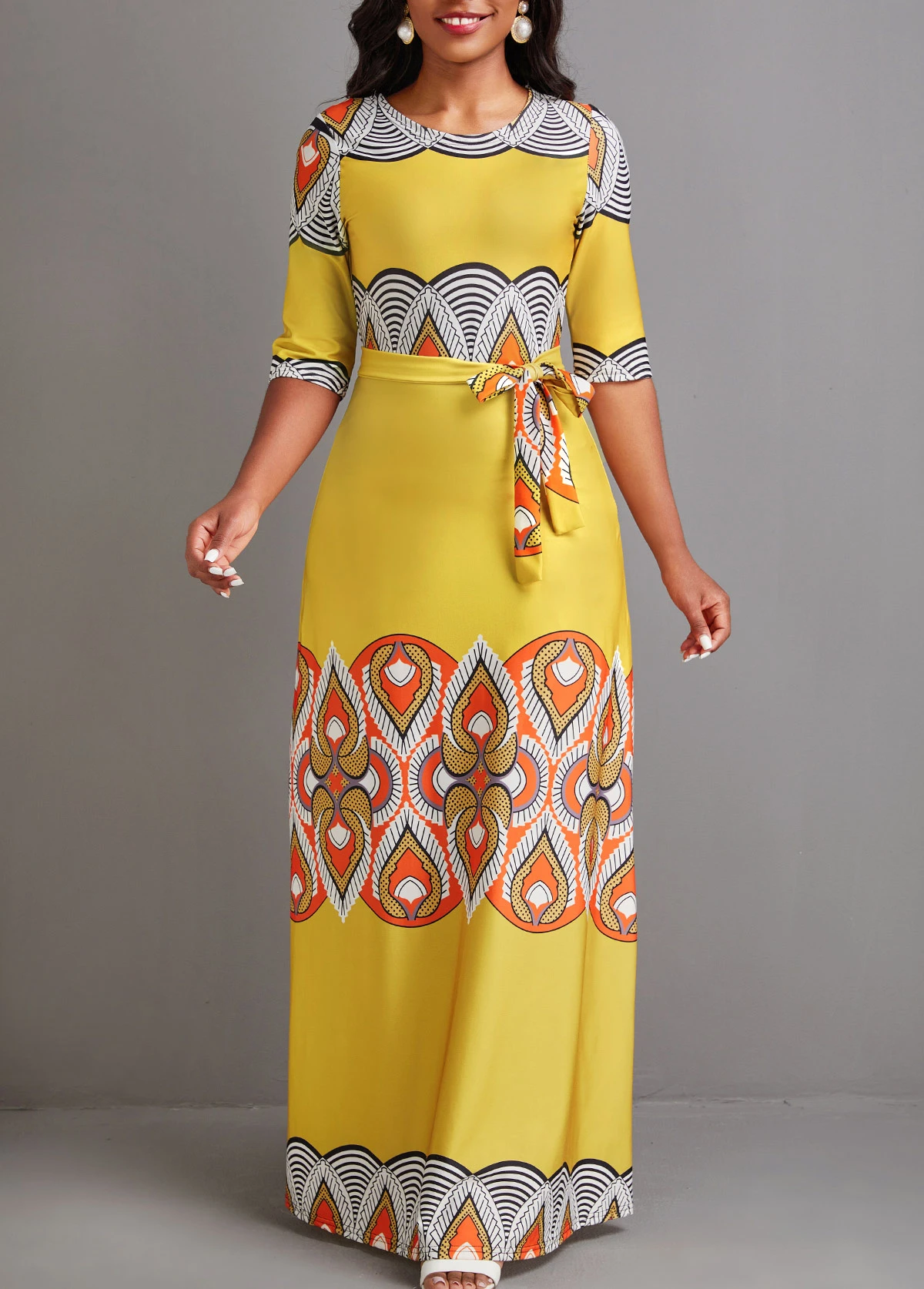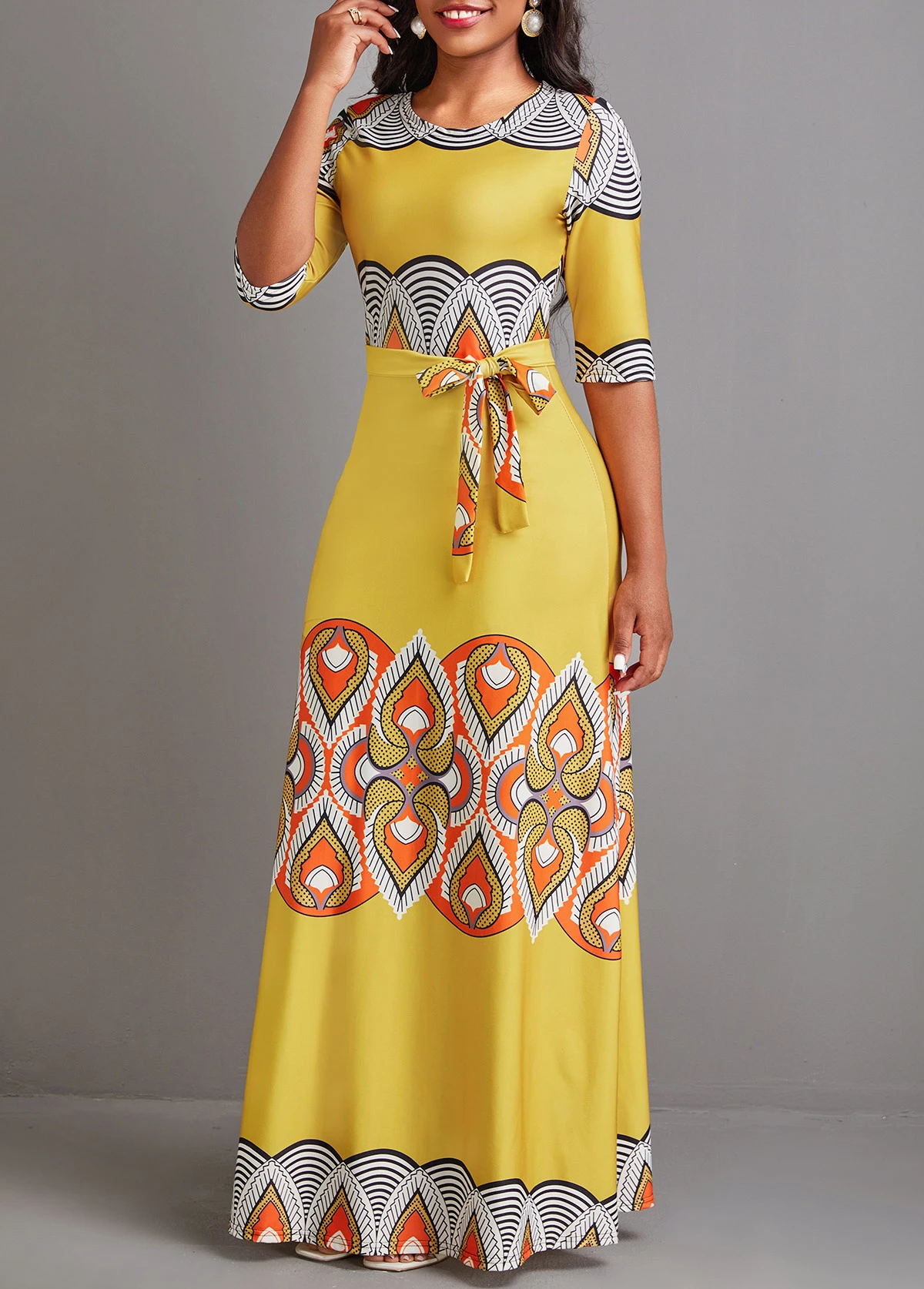 Yellow Tie African Tribal Print Belted Maxi Dress
